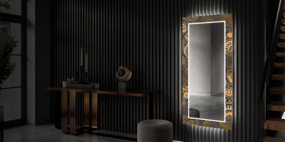 Tagantjärele valgustatud dekoratiivne peegel koridori jaoks - Vana muster